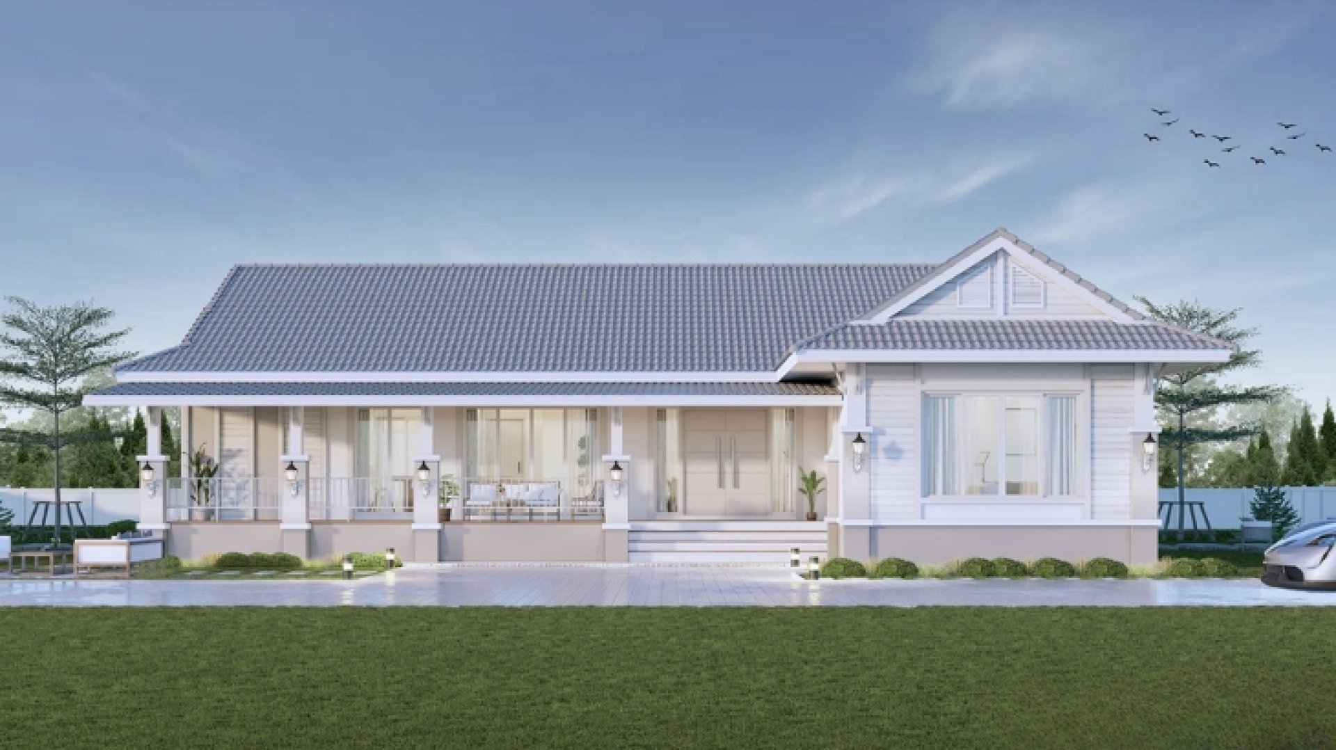 กับแบบบ้าน ชั้นเดียวสไตล์ Contemporary ที่ถ่ายทอดความเรียบง่าย ทันสมัย และความอบอุ่นได้อย่างลงตัว ตัวบ้านเลือกใช้โทนสีขาวเป็นหลัก ช่วยเพิ่มความสว่างและความคลาสสิกให้กับงานสถาปัตยกรรม พร้อมผสมผสานกลิ่นอายธรรมชาติ ทำให้บ้านดูสบายตา และน่าอยู่อาศัยในระยะยาว